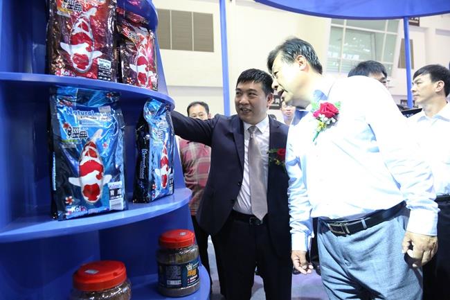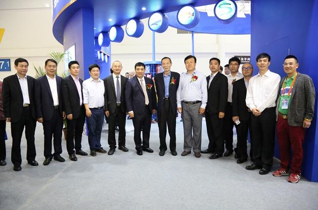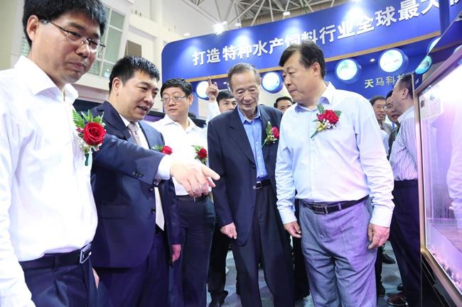 上圖為陳慶堂董事長向于康震副部長,農(nóng)業(yè)部原副部長、中國飼料工業(yè)協(xié)會顧問高鴻賓等領(lǐng)導(dǎo)介紹天馬科技產(chǎn)品及相關(guān)水產(chǎn)品