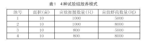 (4)放養(yǎng)模式:至3月12日長江1號扣蟹全部放齊,5月20日南美白對蝦苗放齊。設(shè)置4種不同放養(yǎng)密度進行試驗研究,詳見表1。